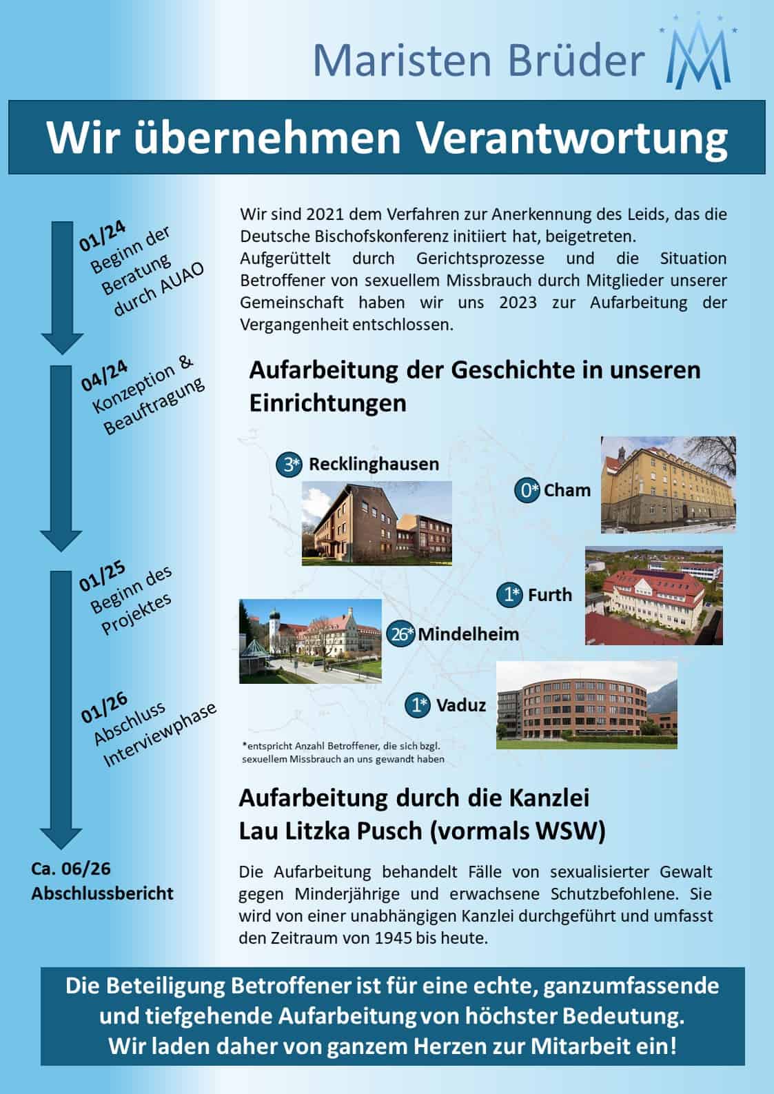 Wir Maristenbrüder haben beschlossen, Fälle sexualisierter Gewalt seit 1945 im Orden von einer unabhängigen Stelle aufarbeiten zu lassen. Die Kanzlei Lau Litzka Pusch (ehemals Westpfahl-Spilker-Wastl) ist dafür ausgewählt worden. Beraten wurden wir dabei vom „Ausschuss für unabhängige Aufarbeitung sexualisierter Gewalt im Bereich von Ordensgemeinschaften (AUAO)“.