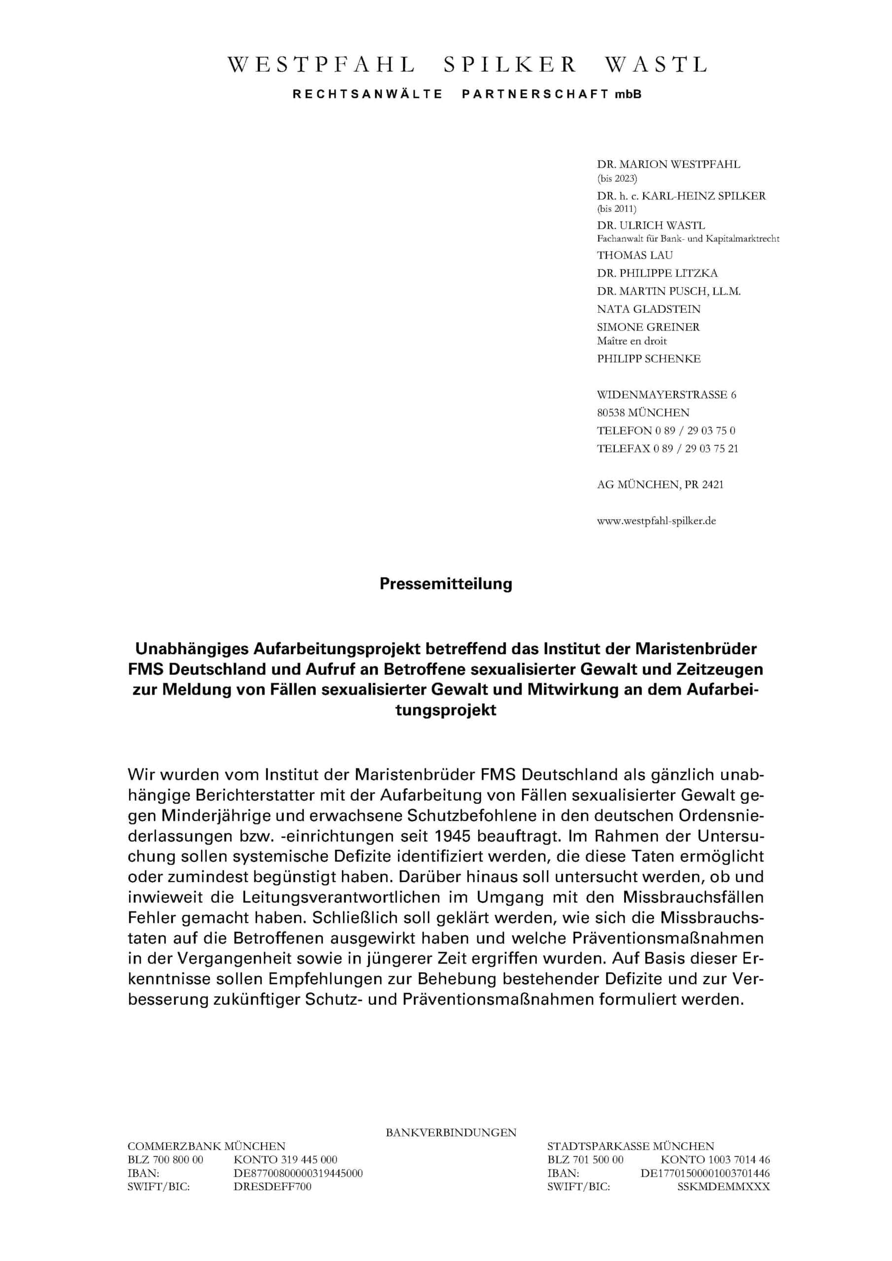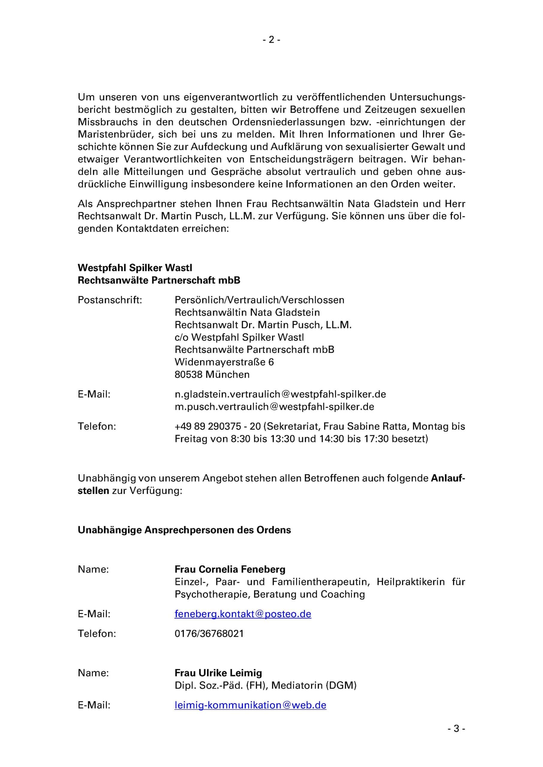 Wir wurden vom Institut der Maristenbrüder FMS Deutschland als gänzlich unabhängige Berichterstatter mit der Aufarbeitung von Fällen sexualisierter Gewalt gegen Minderjährige und erwachsene Schutzbefohlene in den deutschen Ordensniederlassungen bzw. -einrichtungen seit 1945 beauftragt. Im Rahmen der Untersuchung sollen systemische Defizite identifiziert werden, die diese Taten ermöglicht oder zumindest begünstigt haben. Darüber hinaus soll untersucht werden, ob und inwieweit die Leitungsverantwortlichen im Umgang mit den Missbrauchsfällen Fehler gemacht haben. Schließlich soll geklärt werden, wie sich die Missbrauchstaten auf die Betroffenen ausgewirkt haben und welche Präventionsmaßnahmen in der Vergangenheit sowie in jüngerer Zeit ergriffen wurden. Auf Basis dieser Erkenntnisse sollen Empfehlungen zur Behebung bestehender Defizite und zur Verbesserung zukünftiger Schutz- und Präventionsmaßnahmen formuliert werden.